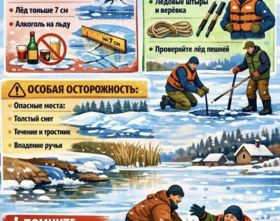 🚫ЗАПРЕЩЕНО:• Выходить на лёд в период его становления и активного таяния.• Выходить на лёд при толщине менее 7 сантиметров.• Находиться на льду в состоянии алкогольного опьянения. ✅ОБЯЗАТЕЛЬНО:• Надевайте спасательный жилет.• Берите с собой средства самоспасения: ледовые штыри (альпенштоки) и спасательный линь (верёвку).• Проверяйте лёд пешнёй или прочной палкой, а не...